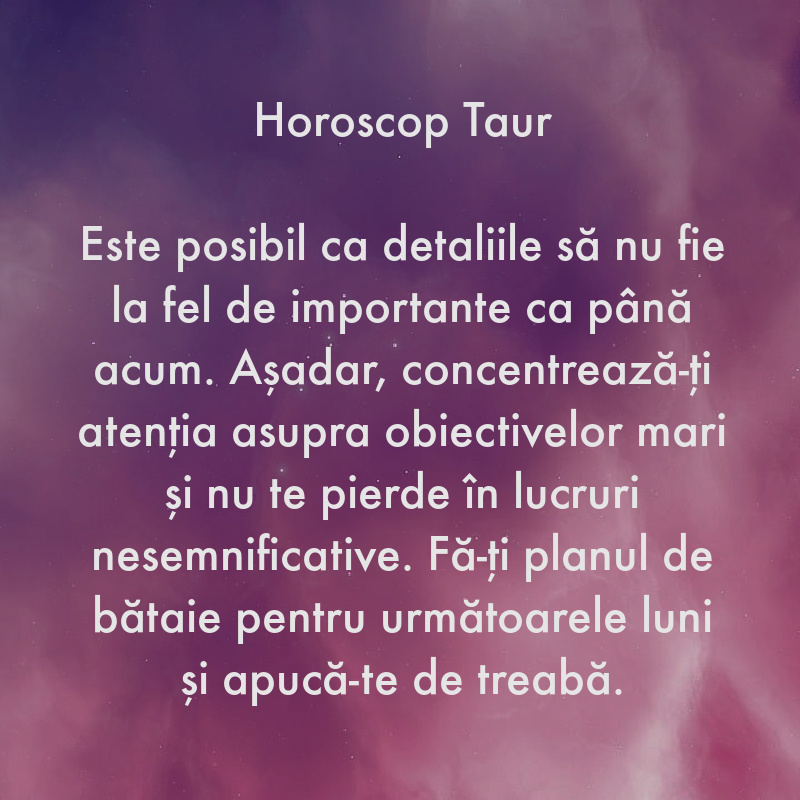 Este posibil ca detaliile să nu fie la fel de importante ca până acum. Așadar, concentrează-ți atenția asupra obiectivelor mari și nu te pierde în lucruri nesemnificative. Fă-ți planul de bătaie pentru următoarele luni și apucă-te de treabă.