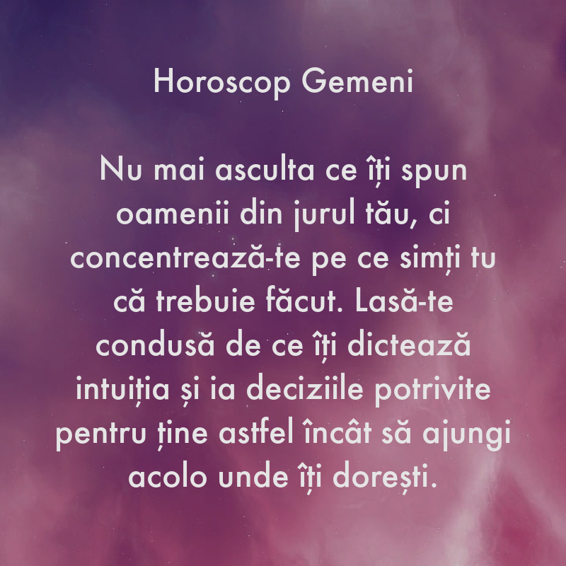 Nu mai asculta ce îți spun oamenii din jurul tău, ci concentrează-te pe ce simți tu că trebuie făcut. Lasă-te condusă de ce îți dictează intuiția și ia deciziile potrivite pentru ține astfel încât să ajungi acolo unde îți dorești.