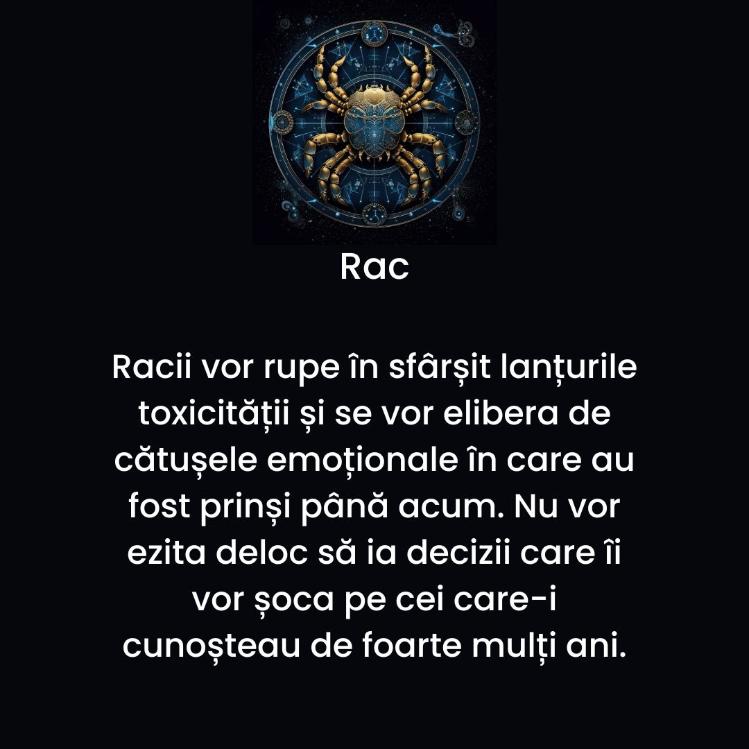 Racul, semn cardinal de apă, cunoscut pentru intuiția și natura sa grijulie va avea una dintre cele mai mari transformări în anul 2024. Nativii acestei zodii se vor afla pe un drum al auto-descoperirii care va veni cu provocările și răsplățile sale. Racii vor rupe în sfârșit lanțurile toxicității și se vor elibera de cătușele emoționale în care au fost prinși până acum. Nu vor ezita deloc să ia decizii care îi vor șoca pe cei care-i cunoșteau de foarte mulți ani. Racii vor înțelege că toate aceste schimbări sunt benefice. Își vor urma inima și instinctul, iar anul următor le va deschide ochii cu privire la toți oamenii manipulatori din viața lor care trebuie eliminați. Racii vor căuta să se înconjoare cu vibrații energetice din ce în ce mai înalte care îi vor catapulta în viață în ceea ce privește progresul, fericirea și pacea sufletească.