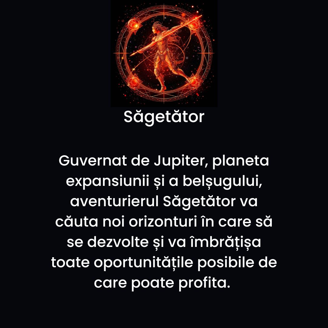 Săgetătorul, arcașul de foc al zodiacului, este destinat unei transformări cu adevărat incredibile în anul ce urmează. Guvernat de Jupiter, planeta expansiunii și a belșugului, aventurierul Săgetător va căuta noi orizonturi în care să se dezvolte și va îmbrățișa toate oportunitățile posibile de care poate profita. Pentru cei din jurul său va părea un an aglomerat, dar Săgetătorul, spirit mereu curios, va crește în aceasta energie și se va maturiza și mai mult spiritual. Evoluția personală și explorarea neîncetată le va deschide ușile către un nou tărâm al posibilităților, unul care credeau că nu este posibil. Se vor bucura mai mult de lucrurile care până acum le erau străine și vor descoperi că noul mediu sau noul rol pe care-l joacă li se potrivește perfect. Sunt în drumul spre destinul lor și nimic nu îi va opri.