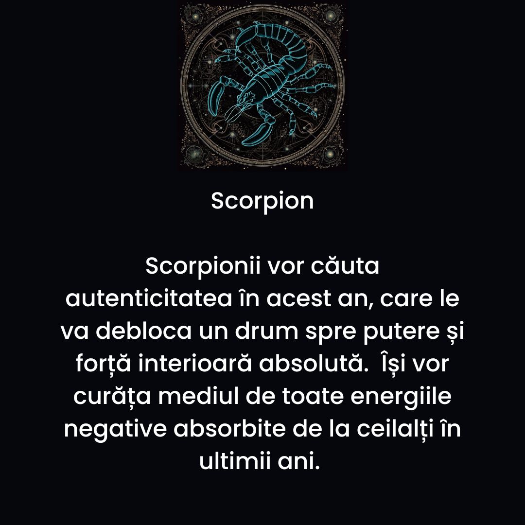 Un alt semn de apă care va trece printr-o transformare majoră este Scorpionul, cea de-a 8-a zodie, guvernat de Pluto, planeta transformării, care tocmai a ieșit din Retrograd și care va intra în Vărsător la începutul anului viitor. Scorpionii vor căuta autenticitatea în acest an, care le va debloca un drum spre putere și forță interioară absolută. Vor avea toleranță 0 pentru ipocrizia din jurul lor și își vor curăța mediul de toate energiile negative absorbite de la ceilalți în ultimii ani. Obstacolele de care vor trece nu se vor mai întoarce niciodată să-i încetinească. Vor renunța la obiceiurile proaste, la joburile care-i seacă de energie și se vor alinia complet cu dorințele inimii. Își vor redefini identitatea și își vor dezvolta talentele unice. Se vor înconjura de oameni cu un set de valori asemănător, iar pentru unii vor deveni chiar mentori.