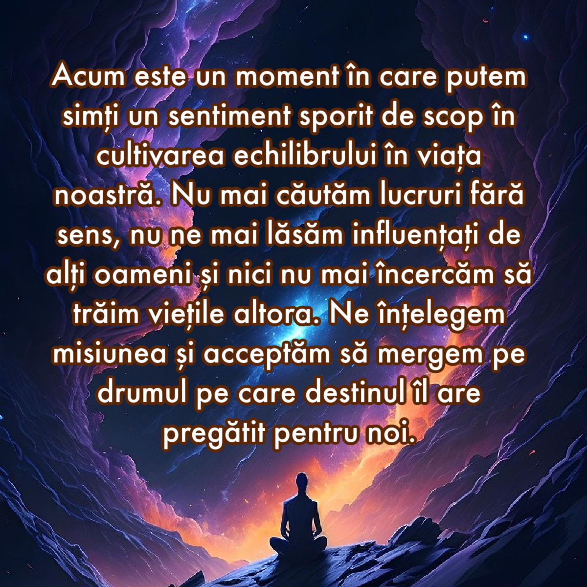 Acum este un moment în care putem simți un sentiment sporit de scop în cultivarea echilibrului în viața noastră. Nu mai căutăm lucruri fără sens, nu ne mai lăsăm influențați de alți oameni și nici nu mai încercăm să trăim viețile altora. Ne înțelegem misiunea și acceptăm să mergem pe drumul pe care destinul îl are pregătit pentru noi.