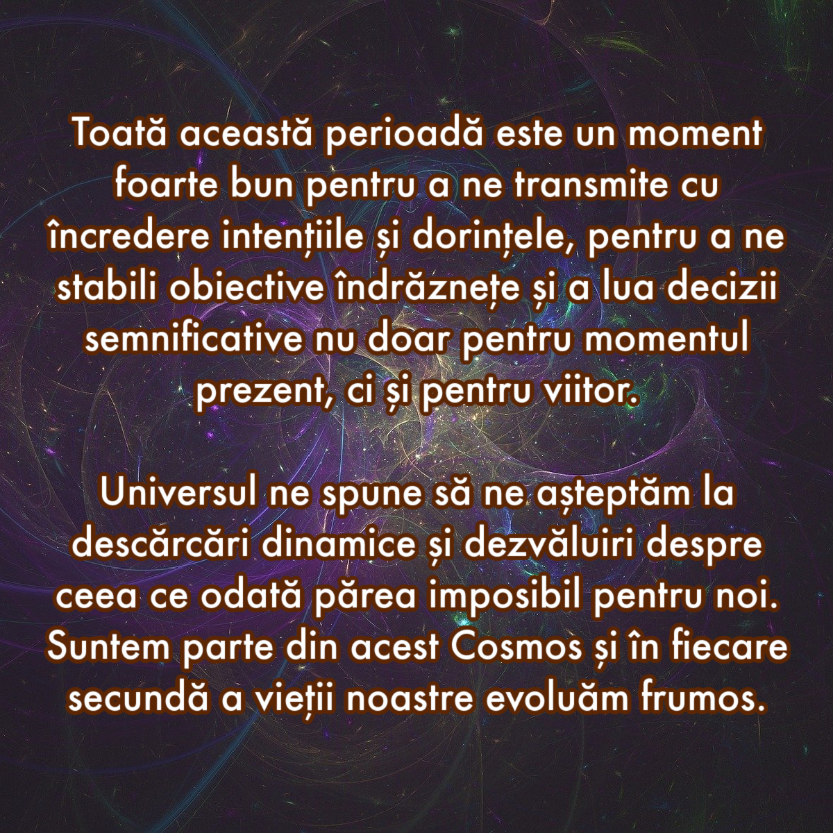 Universul ne spune să ne așteptăm la descărcări dinamice și dezvăluiri despre ceea ce odată părea imposibil pentru noi. Suntem parte din acest Cosmos și în fiecare secundă a vieții noastre evoluăm frumos.