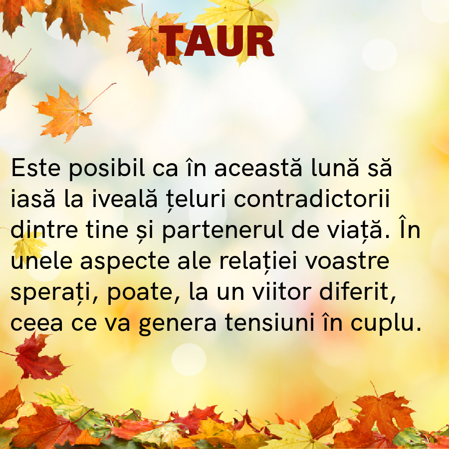 Este posibil ca în această lună să iasă la iveală țeluri contradictorii dintre tine și partenerul de viață. În unele aspecte ale relației voastre sperați, poate, la un viitor diferit, ceea ce va genera tensiuni în cuplu.