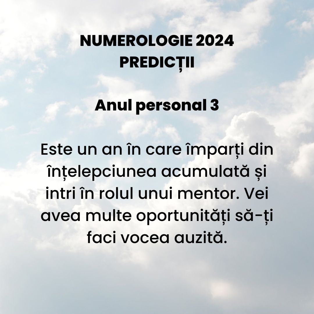 Anul personal 3 în 2024 te va face să te concentrezi pe găsirea vocii, pe comunicarea gândurilor și pe o aventură care are ca scop găsirea adevărului. Este un an în care împarți din înțelepciunea acumulată și intri în rolul unui mentor. Vei avea multe oportunități să-ți faci vocea auzită. Îți vei crea un spirit al comunității, chiar dacă viața ta socială a trecut prin mai multe schimbări. Vei căuta să te conectezi cu grupuri care împart aceleași valori cu tine sau vei deveni un membru mult mai activ în comunitatea ta locală. Este un an în care te poți înscrie la noi cursuri, cluburi sau activități de grup diverse. Te vei simți mult mai împlinită în compania oamenilor, mai ales dacă veți împărți un țel comun.