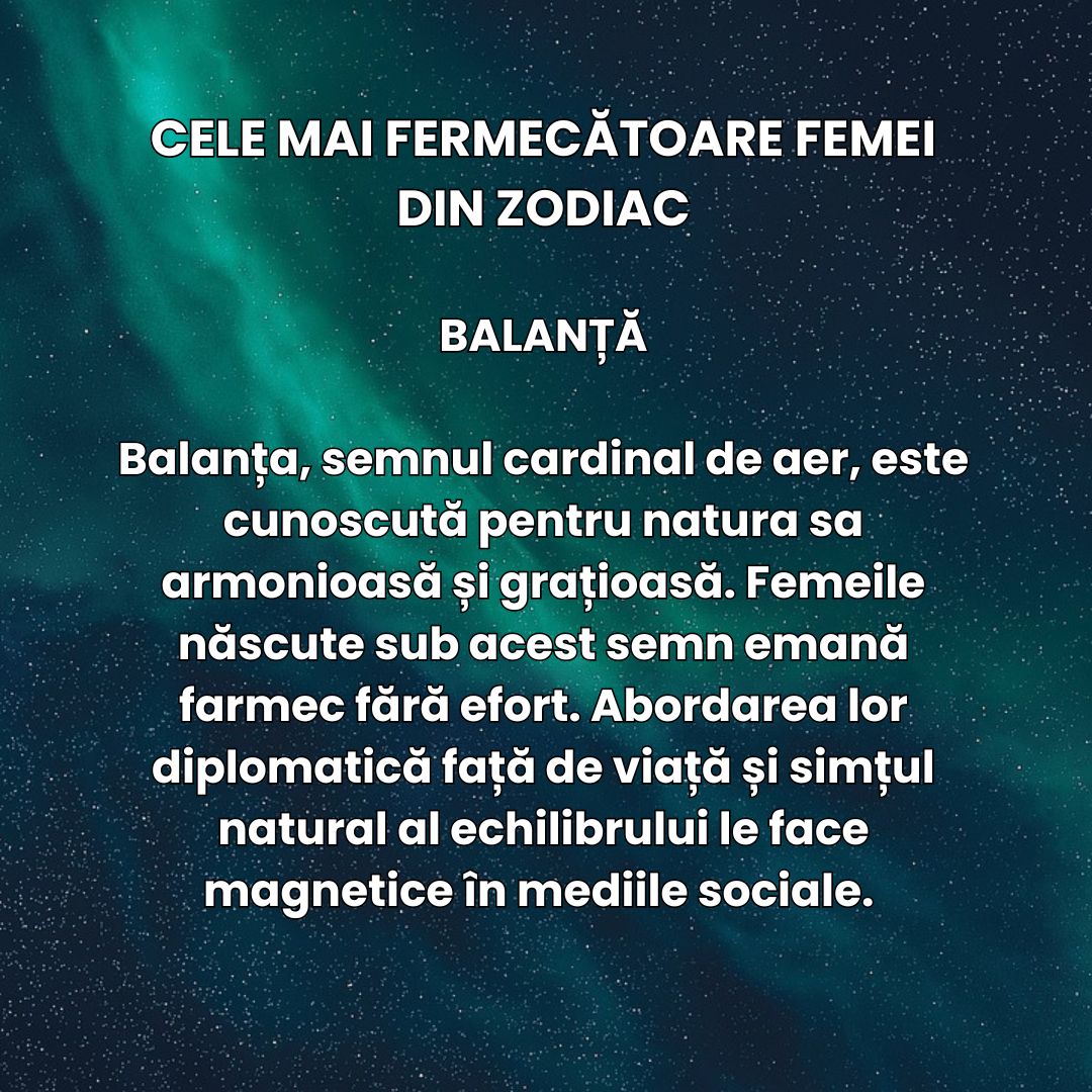 Balanța, semnul cardinal de aer, este cunoscută pentru natura sa armonioasă și grațioasă. Femeile născute sub acest semn emană farmec fără efort. Abordarea lor diplomatică față de viață și simțul natural al echilibrului le face magnetice în mediile sociale. Femeile Balanță posedă o frumusețe captivantă care merge dincolo de fizic – este farmecul emanat de bunătatea și echilibrul lor.