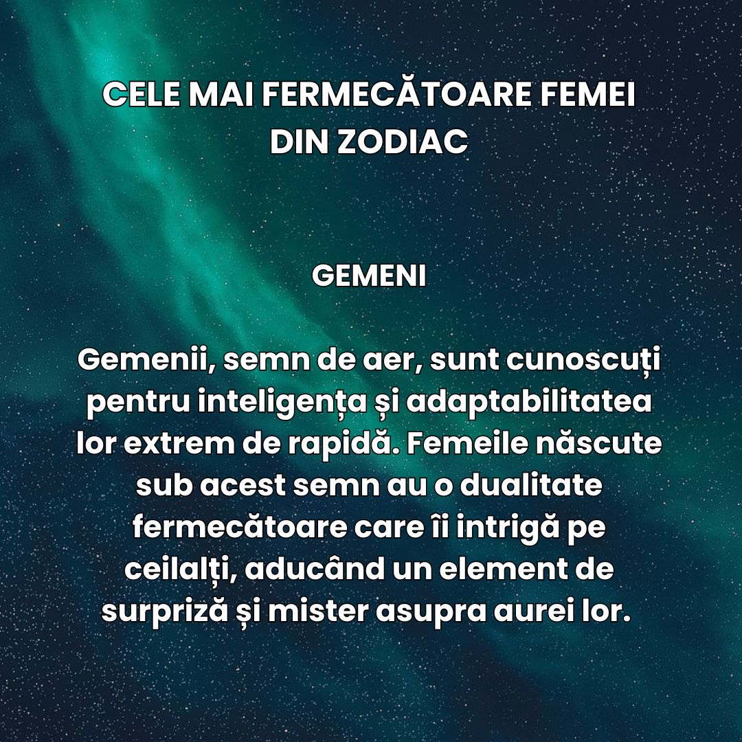 Gemenii, semn de aer, sunt cunoscuți pentru inteligența și adaptabilitatea lor extrem de rapidă. Femeile născute sub acest semn au o dualitate fermecătoare care îi intrigă pe ceilalți, aducând un element de surpriză și mister asupra aurei lor. Abilitatea lor de a comuta fără efort între dispoziții și interese le face cei mai fascinanți parteneri de conversație pe care îi poți întâlni.