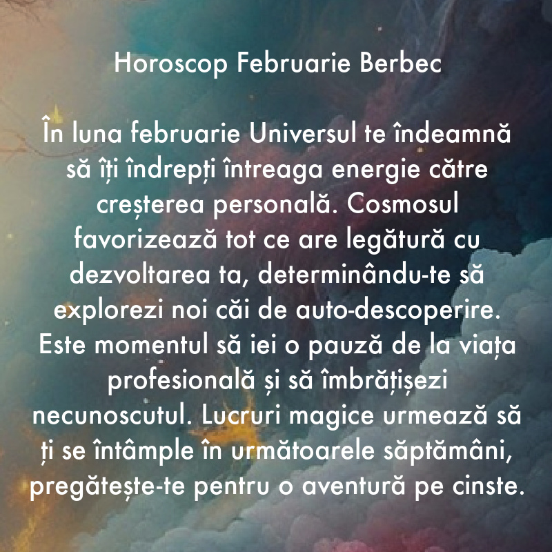 În luna februarie Universul te îndeamnă să îți îndrepți întreaga energie către creșterea personală. Cosmosul favorizează tot ce are legătură cu dezvoltarea ta, determinându-te să explorezi noi căi de auto-descoperire. Este momentul să iei o pauză de la viața profesională și să îmbrățișezi necunoscutul. Lucruri magice urmează să ți se întâmple în următoarele săptămâni, pregătește-te pentru o aventură pe cinste.