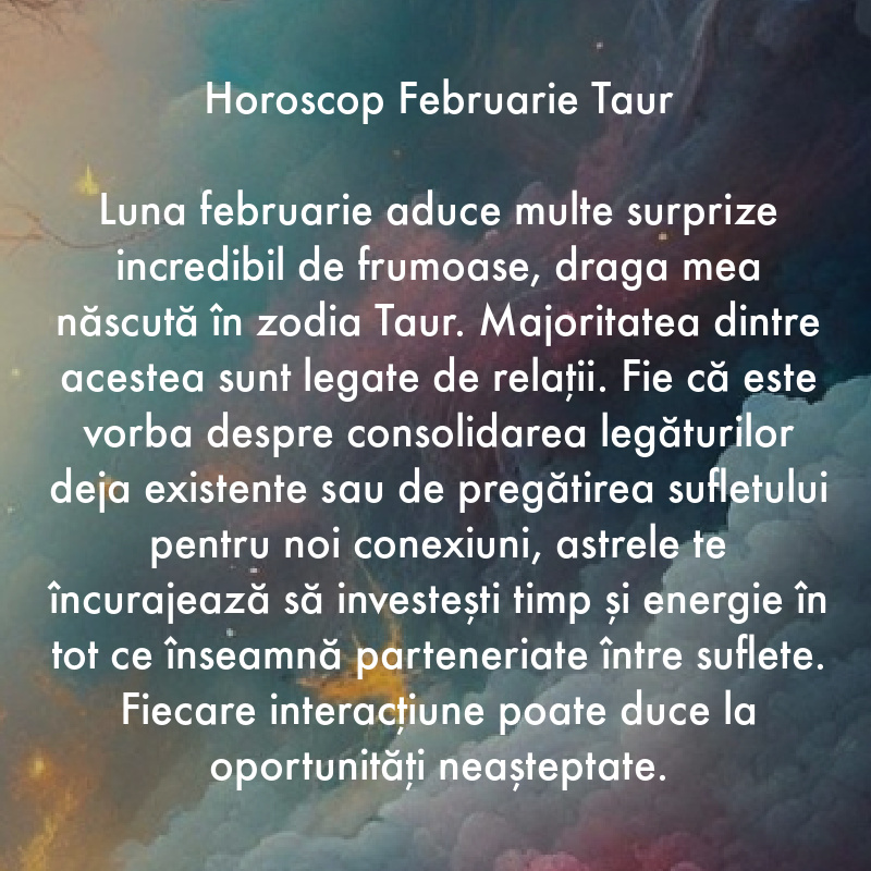 Luna februarie aduce multe surprize incredibil de frumoase, draga mea născută în zodia Taur. Majoritatea dintre acestea sunt legate de relații. Fie că este vorba despre consolidarea legăturilor deja existente sau de pregătirea sufletului pentru noi conexiuni, astrele te încurajează să investești timp și energie în tot ce înseamnă parteneriate între suflete. Fiecare interacțiune poate duce la oportunități neașteptate.