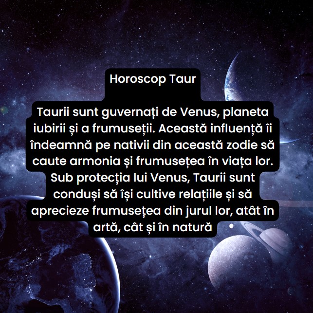 Taurii sunt guvernați de Venus, planeta iubirii și a frumuseții. Această influență îi îndeamnă pe nativii din această zodie să caute armonia și frumusețea în viața lor. Sub protecția lui Venus, Taurii sunt conduși să își cultive relațiile și să aprecieze frumusețea din jurul lor, atât în artă, cât și în natură.
