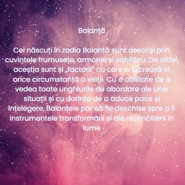 Cei născuți în zodia Balanță sunt descriși prin cuvintele frumusețe, armonie și echilibru. De altfel, aceștia sunt și „factorii” cu care ei lucrează în orice circumstanță a vieții. Cu o abilitate de a vedea toate unghiurile de abordare ale unei situații și cu dorința de a aduce pace și înțelegere, Balanțele par să fie deschise spre a fi instrumentele transformării și ale reconcilierii în lume.