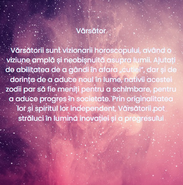 Vărsătorii sunt vizionarii horoscopului, având o viziune amplă și neobișnuită asupra lumii. Ajutați de abilitatea de a gândi în afara „cutiei”, dar și de dorința de a aduce noul în lume, nativii acestei zodii par să fie meniți pentru a schimbare, pentru a aduce progres în societate. Prin originalitatea lor și spiritul lor independent, Vărsătorii pot străluci în lumina inovației și a progresului.