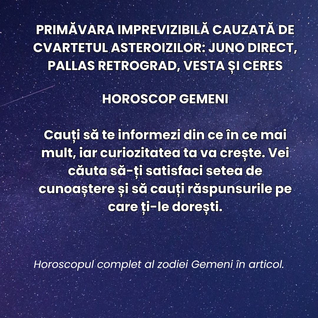 Primăvara aceasta este marcată de tranzitul celor patru asteroizi majori: Juno, Pallas, Vesta și Ceres. Pline de subtilitate, acestea ne pot lua prin surprindere aducând, împreună cu tranzitul planetelor importante, schimbări și decizii bruște, aducându-și forțele într-un val incontrolabil.