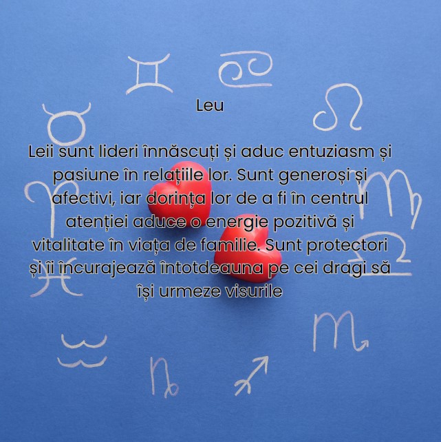 Leii sunt lideri înnăscuți și aduc entuziasm și pasiune în relațiile lor. Sunt generoși și afectivi, iar dorința lor de a fi în centrul atenției aduce o energie pozitivă și vitalitate în viața de familie. Sunt protectori și îi încurajează întotdeauna pe cei dragi să își urmeze visurile.