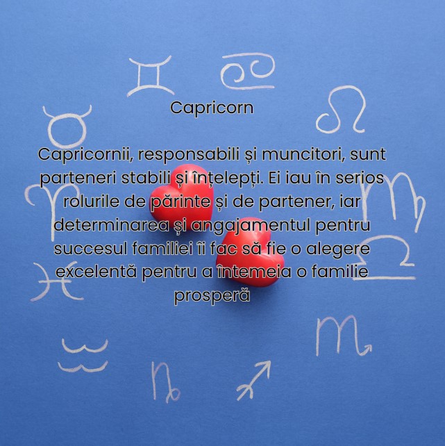 Capricornii, responsabili și muncitori, sunt parteneri stabili și înțelepți. Ei iau în serios rolurile de părinte și de partener, iar determinarea și angajamentul pentru succesul familiei îi fac să fie o alegere excelentă pentru a întemeia o familie prosperă.