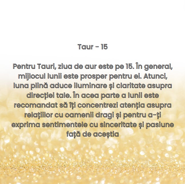 Pentru Tauri, ziua de aur este pe 15. În general, mijlocul lunii este prosper pentru ei. Atunci, luna plină aduce iluminare și claritate asupra direcției tale. În acea parte a lunii este recomandat să îți concentrezi atenția asupra relațiilor cu oamenii dragi și pentru a-ți exprima sentimentele cu sinceritate și pasiune față de aceștia.