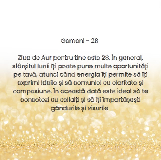 Ziua de Aur pentru tine este 28. În general, sfârșitul lunii îți poate pune multe oportunități pe tavă, atunci când energia îți permite să îți exprimi ideile și să comunici cu claritate și compasiune. În această dată este ideal să te conectezi cu ceilalți și să îți împartășești gândurile și visurile.