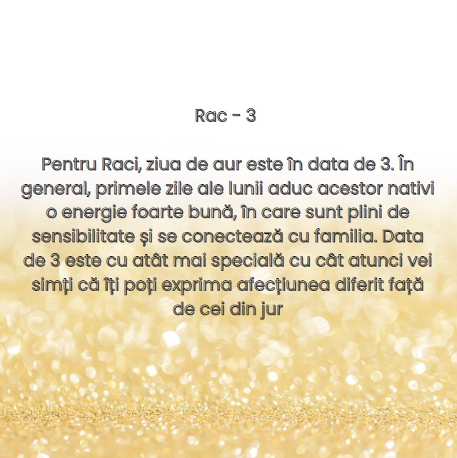 Pentru Raci, ziua de aur este în data de 3. În general, primele zile ale lunii aduc acestor nativi o energie foarte bună, în care sunt plini de sensibilitate și se conectează cu familia. Data de 3 este cu atât mai specială cu cât atunci vei simți că îți poți exprima afecțiunea diferit față de cei din jur.