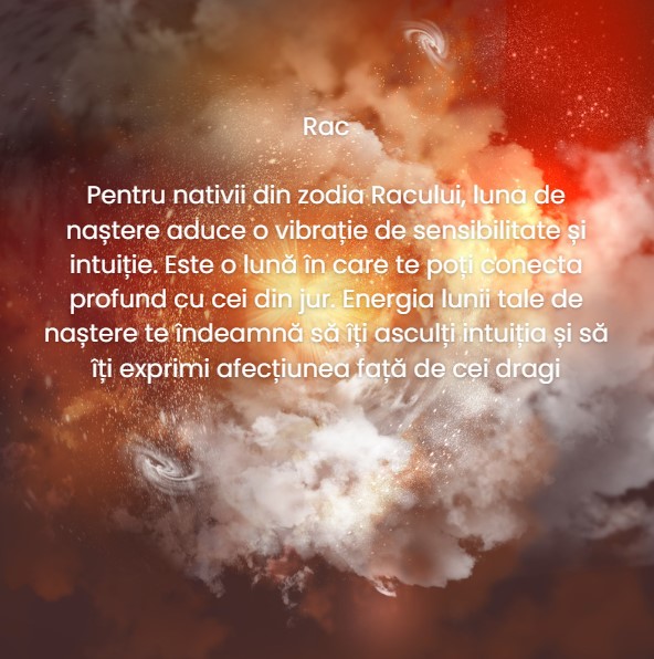 Pentru nativii din zodia Racului, luna de naștere aduce o vibrație de sensibilitate și intuiție. Este o lună în care te poți conecta profund cu cei din jur. Energia lunii tale de naștere te îndeamnă să îți asculți intuiția și să îți exprimi afecțiunea față de cei dragi.