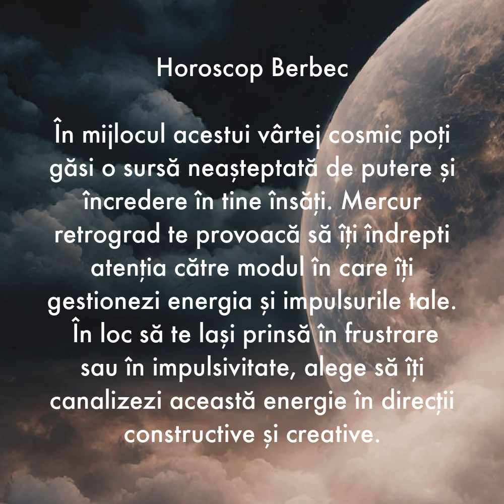 În mijlocul acestui vârtej cosmic poți găsi o sursă neașteptată de putere și încredere în tine însăți. Mercur retrograd te provoacă să îți îndrepti atenția către modul în care îți gestionezi energia și impulsurile tale. În loc să te lași prinsă în frustrare sau în impulsivitate, alege să îți canalizezi această energie în direcții constructive și creative. Prin asumarea unui rol de lider în propriul tău univers, vei găsi o forță interioară care te va ghida în mijlocul oricăror tulburări cosmice.