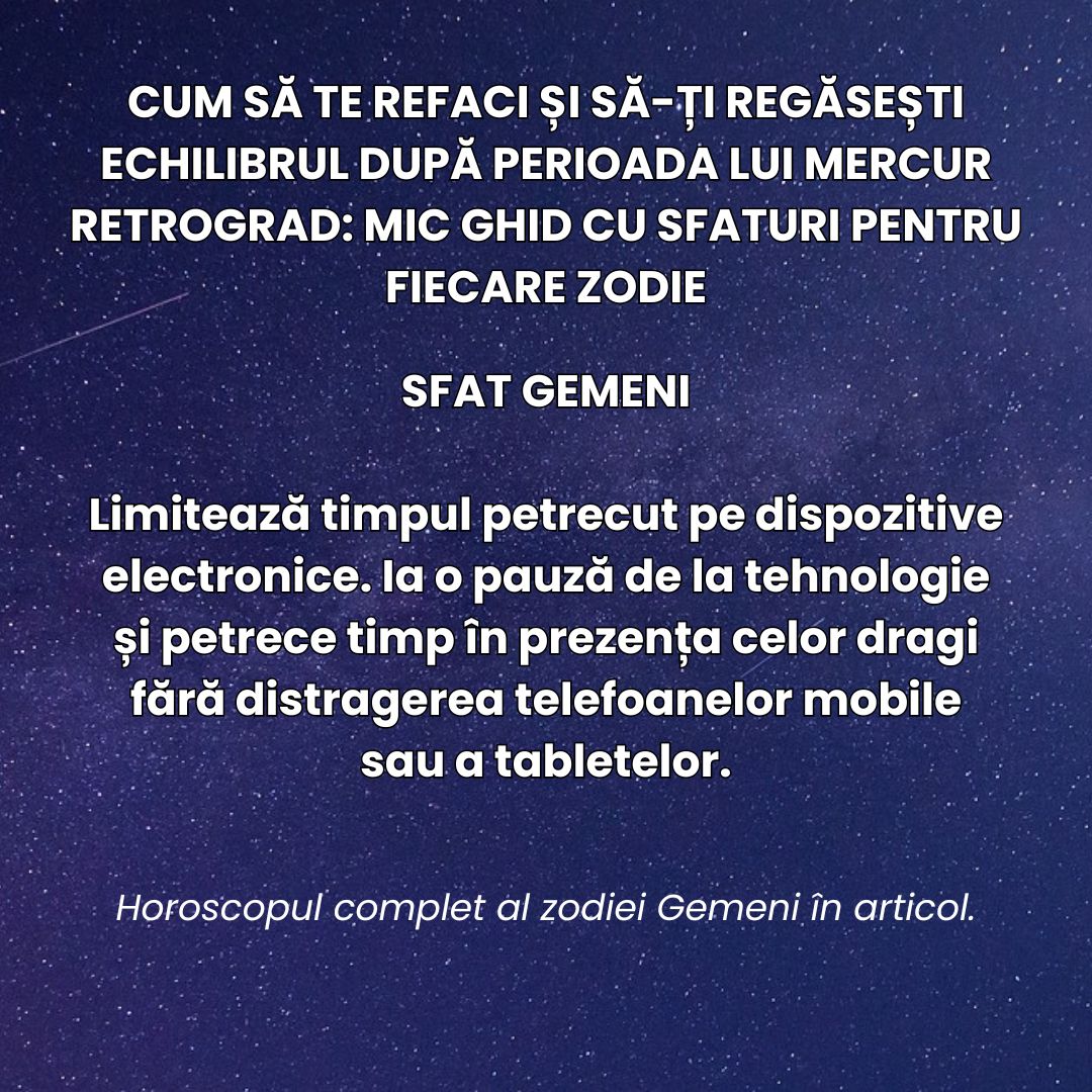 Gemenii, fiind guvernați de Mercur, pot simți în mod special impactul retrogradării micii planete. Folosește această perioadă pentru a reflecta asupra gândurilor și comunicării tale. Îmbunătățește-ți abilitățile de ascultare și fii conștientă de impactul cuvintelor tale asupra celor din jur.