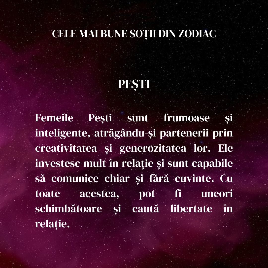 Femeile Pești sunt frumoase și inteligente, atrăgându-și partenerii prin creativitatea și generozitatea lor. Ele investesc mult în relație și sunt capabile să comunice chiar și fără cuvinte. Cu toate acestea, pot fi uneori schimbătoare și caută libertate în relație. Totodată, își pun sufletul pe tavă în fața omului cu care aleg să-și petreacă întreaga viața. Sunt intuitive și ajung într-un stadiu în care-și înțeleg partenerul fără prea multe cuvinte.