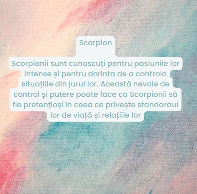 Scorpionii sunt cunoscuți pentru pasiunile lor intense și pentru dorința de a controla situațiile din jurul lor. Această nevoie de control și putere poate face ca Scorpionii să fie pretențioși în ceea ce privește standardul lor de viață și relațiile lor.
