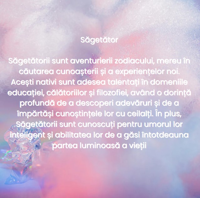 Săgetătorii sunt aventurierii zodiacului, mereu în căutarea cunoașterii și a experiențelor noi. Acești nativi sunt adesea talentați în domeniile educației, călătoriilor și filozofiei, având o dorință profundă de a descoperi adevăruri și de a împărtăși cunoștințele lor cu ceilalți. În plus, Săgetătorii sunt cunoscuți pentru umorul lor inteligent și abilitatea lor de a găsi întotdeauna partea luminoasă a vieții.