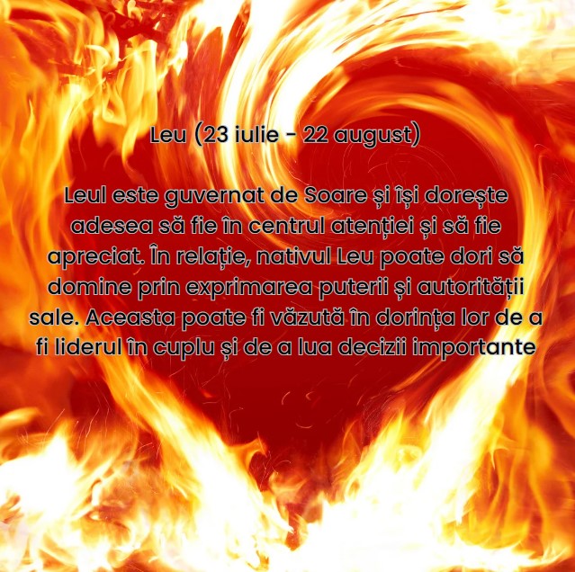 Leul este guvernat de Soare și își dorește adesea să fie în centrul atenției și să fie apreciat. În relație, nativul Leu poate dori să domine prin exprimarea puterii și autorității sale. Aceasta poate fi văzută în dorința lor de a fi liderul în cuplu și de a lua decizii importante.