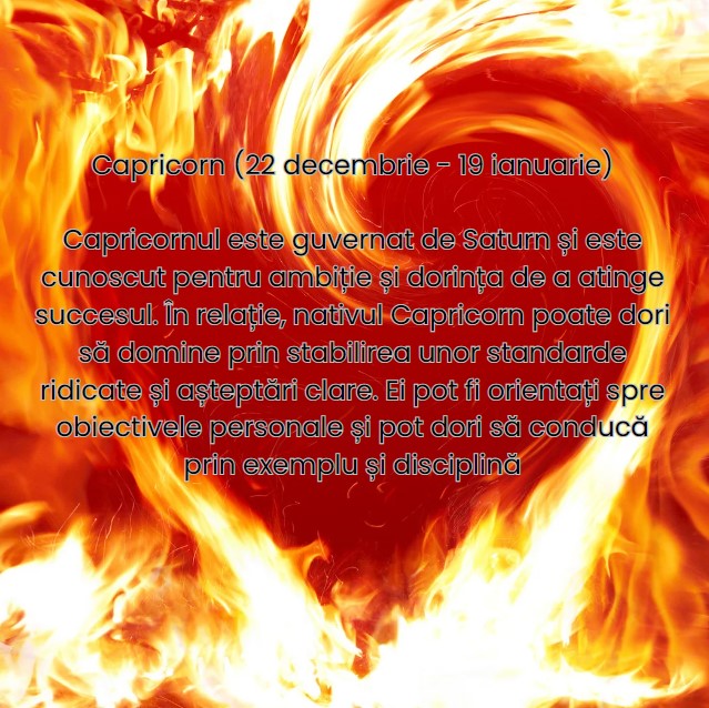 Capricornul este guvernat de Saturn și este cunoscut pentru ambiție și dorința de a atinge succesul. În relație, nativul Capricorn poate dori să domine prin stabilirea unor standarde ridicate și așteptări clare. Ei pot fi orientați spre obiectivele personale și pot dori să conducă prin exemplu și disciplină.