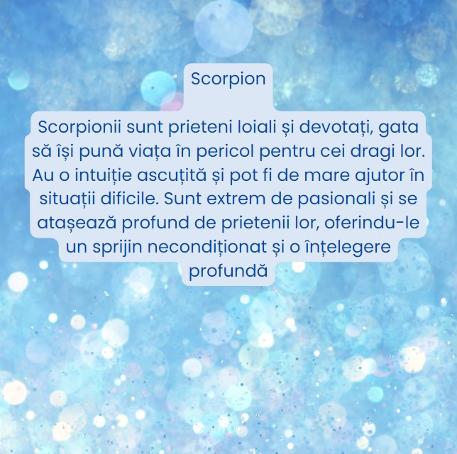 Scorpionii sunt prieteni loiali și devotați, gata să își pună viața în pericol pentru cei dragi lor. Au o intuiție ascuțită și pot fi de mare ajutor în situații dificile. Sunt extrem de pasionali și se atașează profund de prietenii lor, oferindu-le un sprijin necondiționat și o înțelegere profundă.