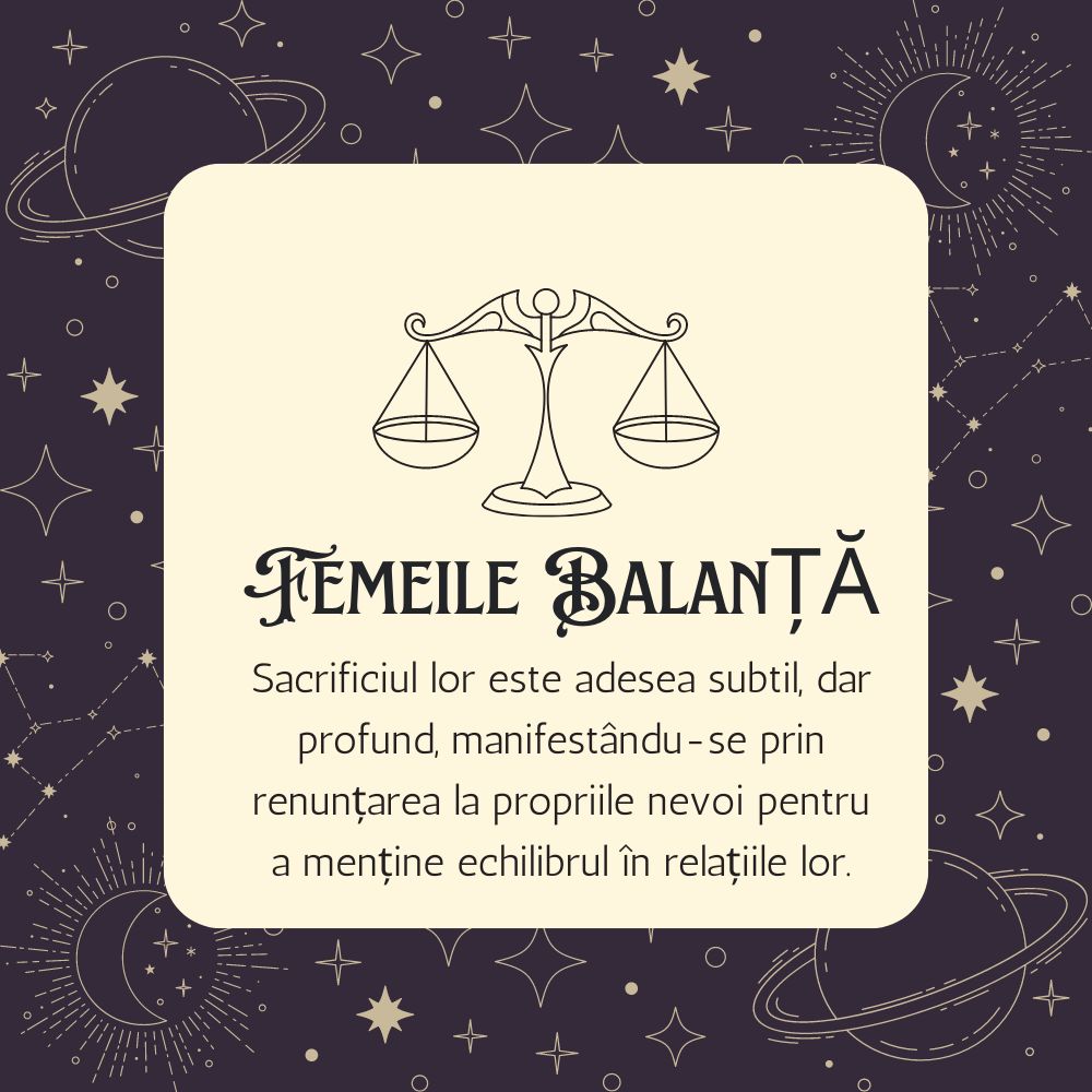 Femeile Balanță sunt călăuzele echilibrului și ale armoniei în lumea noastră tumultoasă. Ele sunt pline de grație și bunăvoință, căutând întotdeauna să aducă pace și înțelegere în relațiile lor și în comunitatea lor. Cu o capacitate unică de a vedea ambele părți ale unei situații, ele sunt adesea mediatorii ideali în conflicte. Sacrificiul lor este adesea subtil, dar profund, manifestându-se prin renunțarea la propriile nevoi pentru a menține echilibrul în relațiile lor.