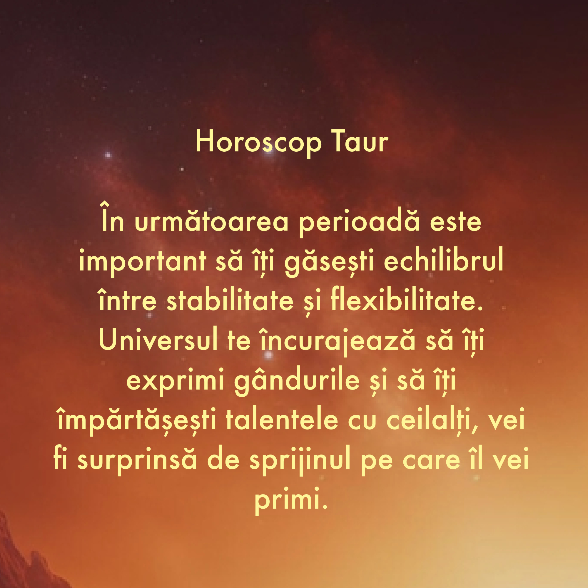 În următoarea perioadă este important să îți găsești echilibrul între stabilitate și flexibilitate. Universul te încurajează să îți exprimi gândurile și să îți împărtășești talentele cu ceilalți, vei fi surprinsă de sprijinul pe care îl vei primi.