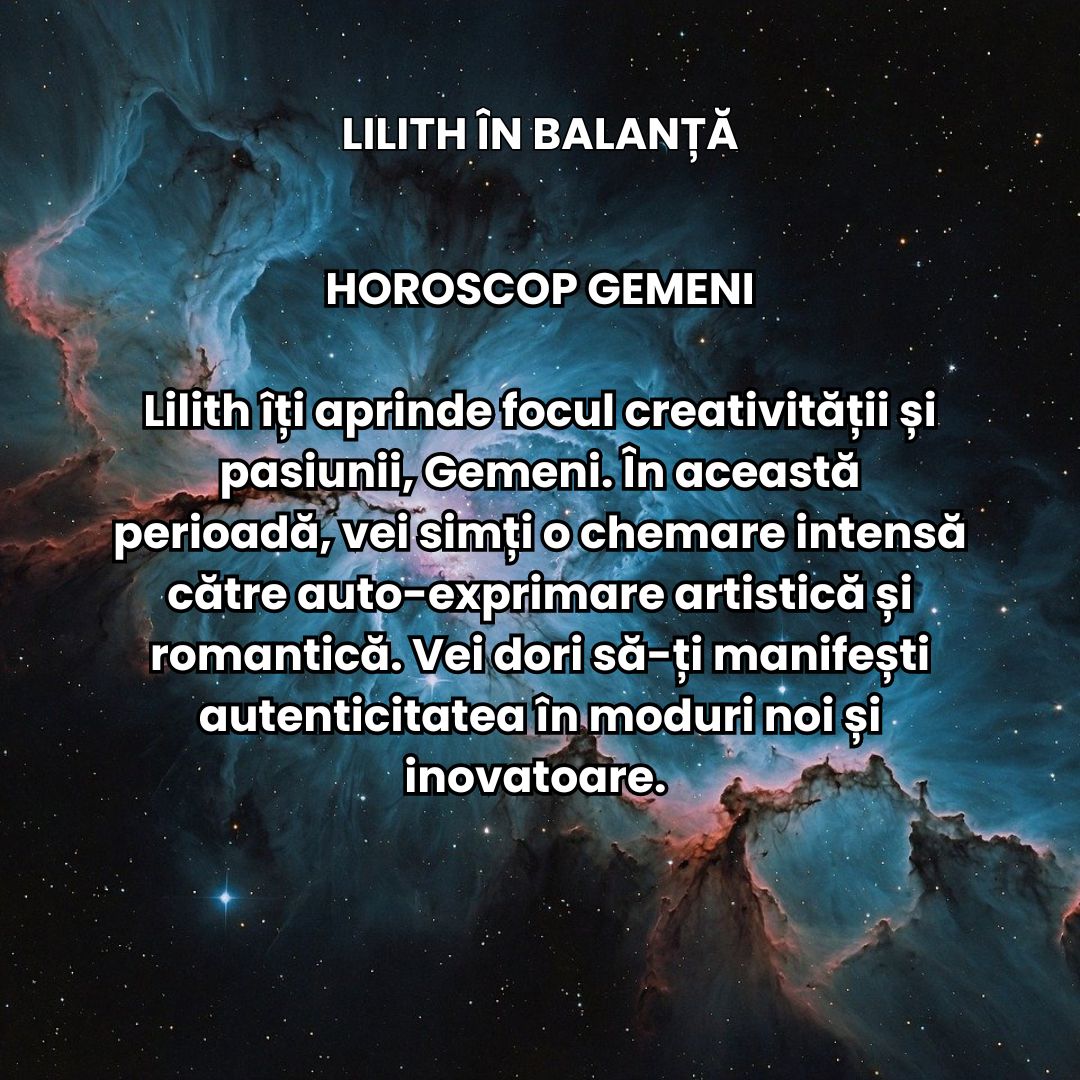 Lilith îți aprinde focul creativității și pasiunii, Gemeni. În această perioadă, vei simți o chemare intensă către auto-exprimare artistică și romantică. Vei dori să-ți manifești autenticitatea în moduri noi și inovatoare. Poate vei întâmpina provocări din partea celor care nu înțeleg această nevoie, dar continuă să strălucești și să-ți urmezi inima.