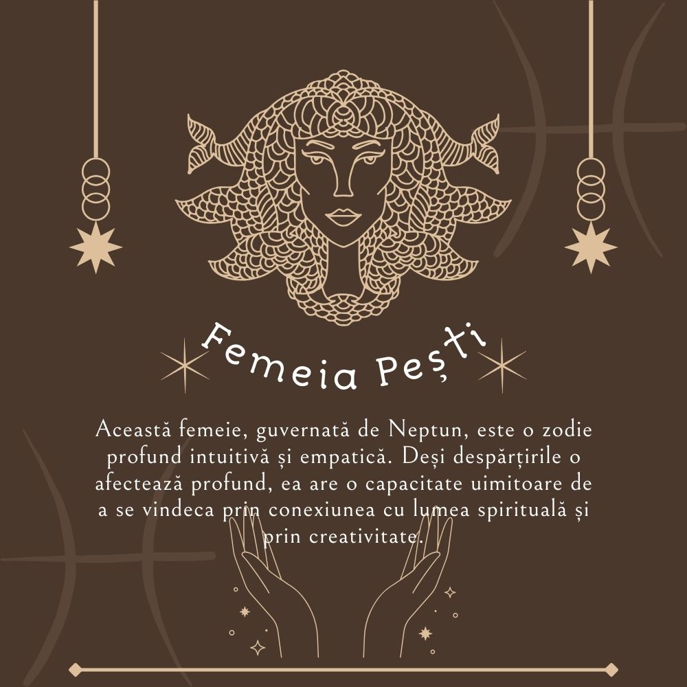 Această femeie, guvernată de Neptun, este o zodie profund intuitivă și empatică. Deși despărțirile o afectează profund, ea are o capacitate uimitoare de a se vindeca prin conexiunea cu lumea spirituală și prin creativitate.