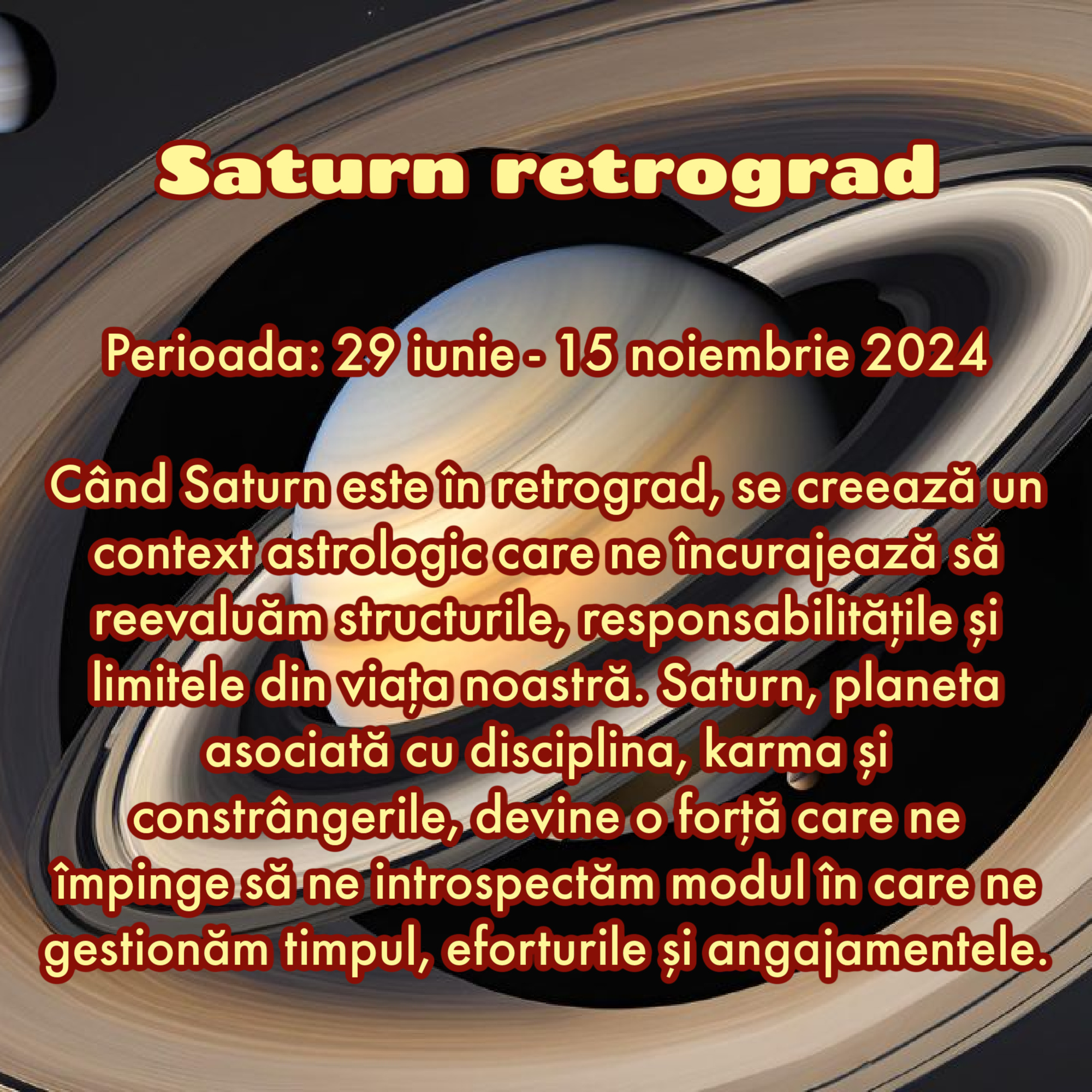 Această perioadă poate aduce cu sine provocări și întârzieri, forțându-ne să ne confruntăm cu realitățile dure ale vieții și să ne consolidăm fundațiile. Totuși, aceste obstacole nu sunt menite să ne descurajeze, ci să ne întărească și să ne pregătească pentru o evoluție durabilă și semnificativă. Retrogradul lui Saturn ne oferă șansa de a ne reconstrui viața pe baze mai solide, promovând un sentiment profund de responsabilitate și înțelepciune.
