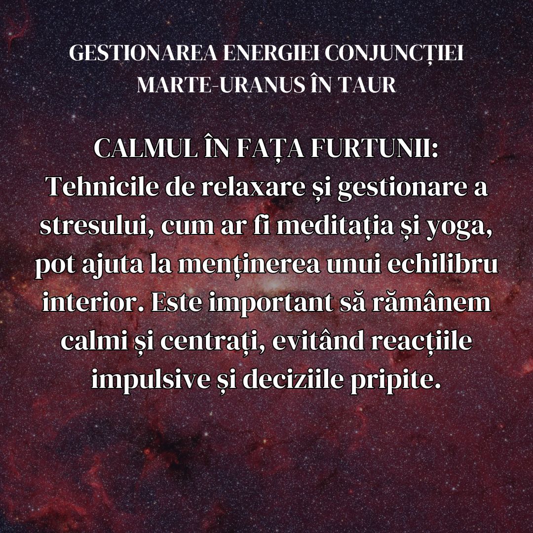 Tehnicile de relaxare și gestionare a stresului, cum ar fi meditația și yoga, pot ajuta la menținerea unui echilibru interior. Este important să rămânem calmi și centrați, evitând reacțiile impulsive și deciziile pripite.
