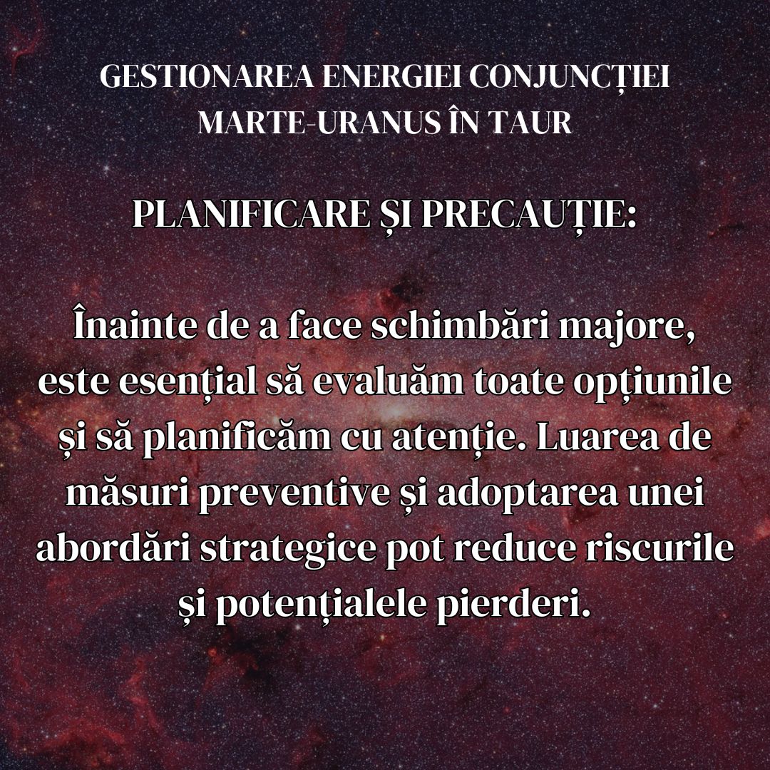 Conjuncția Marte-Uranus în Taur este un fenomen astrologic rar și puternic, care aduce cu sine atât oportunități incredibile, cât și provocări semnificative. Este o perioadă de transformare radicală, unde stabilitatea este pusă la încercare și noi căi sunt deschise. Prin înțelegerea și gestionarea acestor energii dinamice, putem naviga cu succes prin acest peisaj cosmic tulbure, folosind această conjuncție pentru a iniția schimbări pozitive și a progresa către un viitor mai liber și inovator. Această aliniere cosmică ne amintește că, dincolo de haos și incertitudine, există mereu posibilitatea de renaștere și reinventare. Este momentul să ne eliberăm de vechile constrângeri și să îmbrățișăm curajos necunoscutul, transformând provocările în oportunități și visurile în realitate.