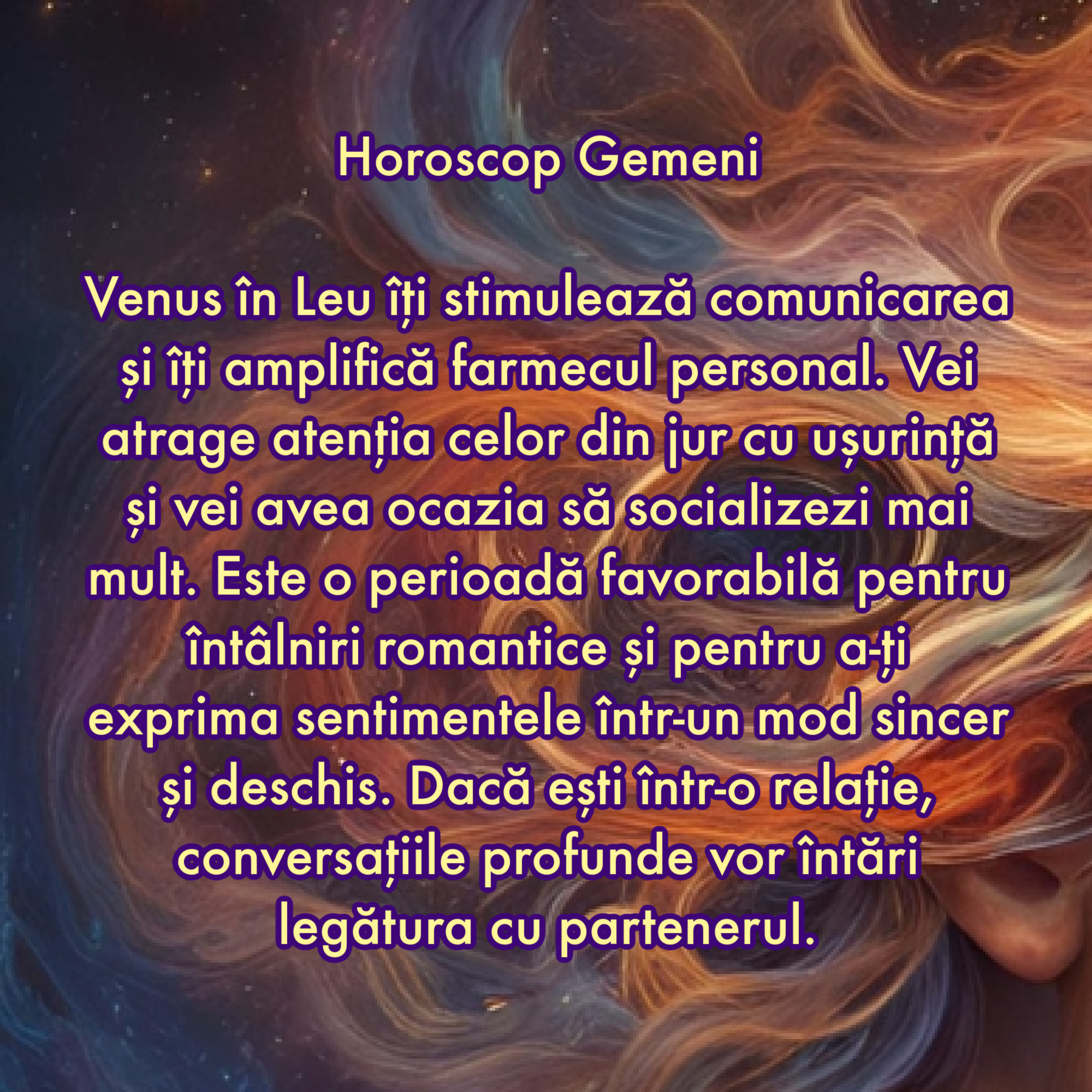 Venus în Leu îți stimulează comunicarea și îți amplifică farmecul personal. Vei atrage atenția celor din jur cu ușurință și vei avea ocazia să socializezi mai mult. Este o perioadă favorabilă pentru întâlniri romantice și pentru a-ți exprima sentimentele într-un mod sincer și deschis. Dacă ești într-o relație, conversațiile profunde vor întări legătura cu partenerul.