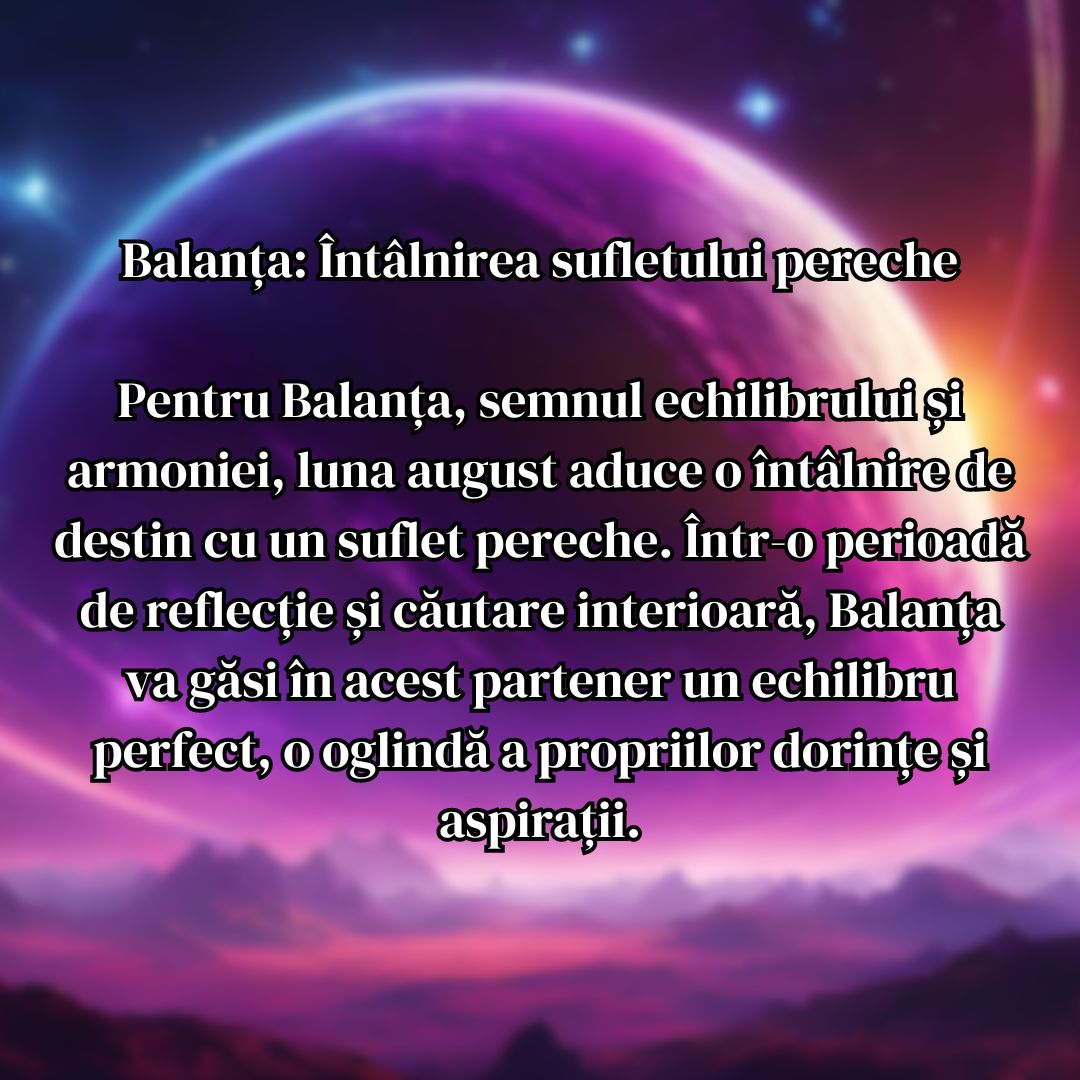 Pentru Balanța, semnul echilibrului și armoniei, luna august aduce o întâlnire de destin cu un suflet pereche. Într-o perioadă de reflecție și căutare interioară, Balanța va găsi în acest partener un echilibru perfect, o oglindă a propriilor dorințe și aspirații.