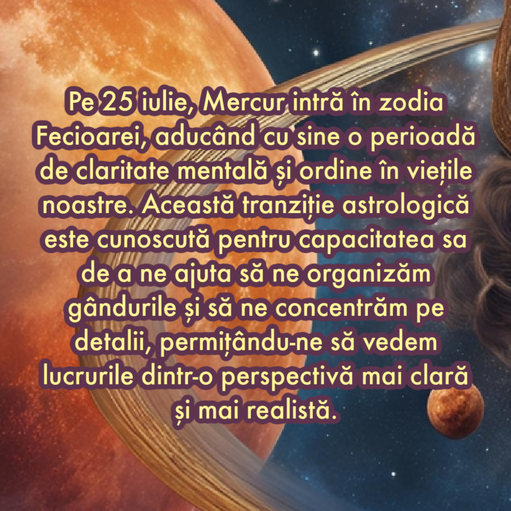Pe 25 iulie, Mercur intră în zodia Fecioarei, aducând cu sine o perioadă de claritate mentală și ordine în viețile noastre. Această tranziție astrologică este cunoscută pentru capacitatea sa de a ne ajuta să ne organizăm gândurile și să ne concentrăm pe detalii, permițându-ne să vedem lucrurile dintr-o perspectivă mai clară și mai realistă.