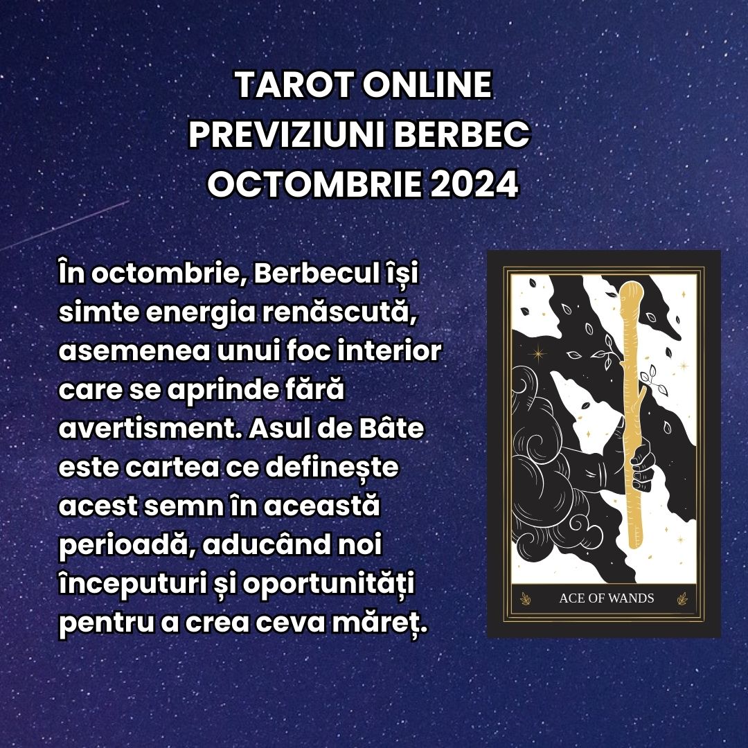 În octombrie, Berbecul își simte energia renăscută, asemenea unui foc interior care se aprinde fără avertisment. Asul de Bâte este cartea ce definește acest semn în această perioadă, aducând noi începuturi și oportunități pentru a crea ceva măreț. Spiritul de luptător al Berbecului va fi ghidat de o inspirație bruscă, o flacără ce poate să deschidă noi drumuri, fie în carieră, fie în viața personală. Cu toate acestea, impulsivitatea caracteristică ar putea să îl facă să acționeze înainte de a gândi prea mult, dar exact asta este frumusețea acestei cărți: te invită să îți asumi riscuri și să îți urmezi instinctele fără teamă. Este timpul pentru Berbec să-și urmeze visurile fără rezerve.