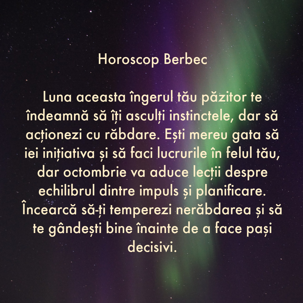 Luna aceasta îngerul tău păzitor te îndeamnă să îți asculți instinctele, dar să acționezi cu răbdare. Ești mereu gata să iei inițiativa și să faci lucrurile în felul tău, dar octombrie va aduce lecții despre echilibrul dintre impuls și planificare. Încearcă să-ți temperezi nerăbdarea și să te gândești bine înainte de a face pași decisivi.