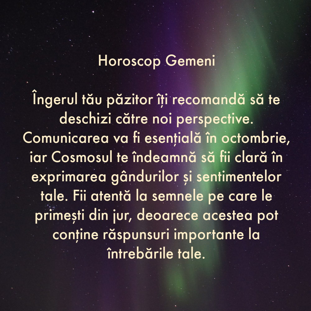 Îngerul tău păzitor îți recomandă să te deschizi către noi perspective. Comunicarea va fi esențială în octombrie, iar Cosmosul te îndeamnă să fii clară în exprimarea gândurilor și sentimentelor tale. Fii atentă la semnele pe care le primești din jur, deoarece acestea pot conține răspunsuri importante la întrebările tale.