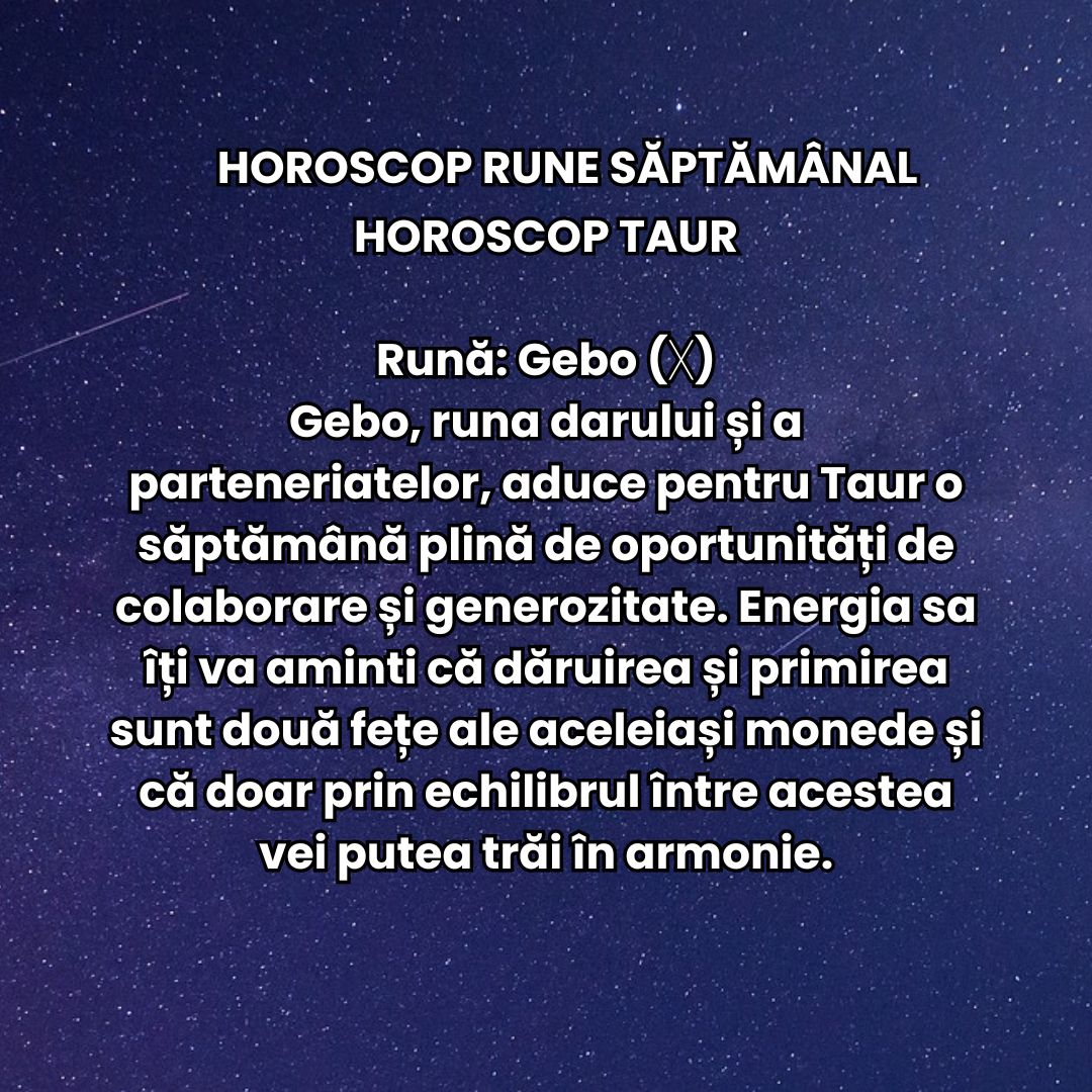 Gebo, runa darului și a parteneriatelor, aduce pentru Taur o săptămână plină de oportunități de colaborare și generozitate. Energia sa îți va aminti că dăruirea și primirea sunt două fețe ale aceleiași monede și că doar prin echilibrul între acestea vei putea trăi în armonie. Este timpul să îți deschizi inima și să oferi din resursele tale emoționale și materiale fără a aștepta ceva în schimb. Gebo îți aduce relații profunde și angajamente reciproce care îți vor îmbogăți viața. Prin recunoștință și generozitate, vei atrage oameni și situații care te vor ajuta să crești și să înflorești.