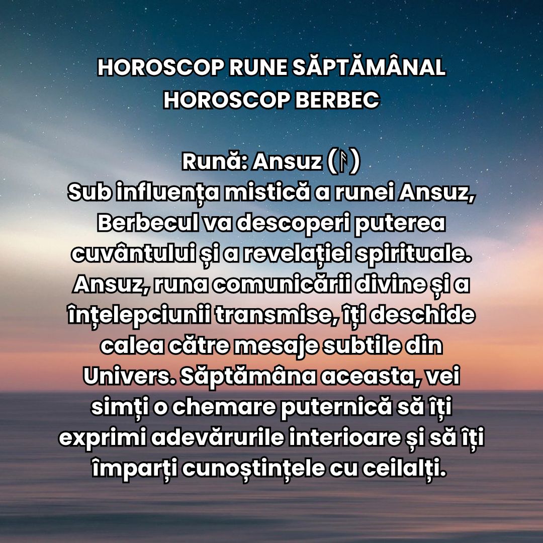 Sub influența mistică a runei Ansuz, Berbecul va descoperi puterea cuvântului și a revelației spirituale. Ansuz, runa comunicării divine și a înțelepciunii transmise, îți deschide calea către mesaje subtile din Univers. Săptămâna aceasta, vei simți o chemare puternică să îți exprimi adevărurile interioare și să îți împarți cunoștințele cu ceilalți. Ansuz îți arată că fiecare cuvânt pe care îl rostești poate schimba realitatea, așa că fii atentă la ceea ce comunici. Energia acestei rune te invită să asculți mai mult, nu doar cu urechile, ci și cu sufletul. Vorbește cu sinceritate, ascultă semnele și lasă-te ghidată de înțelepciunea profundă care curge prin tine.