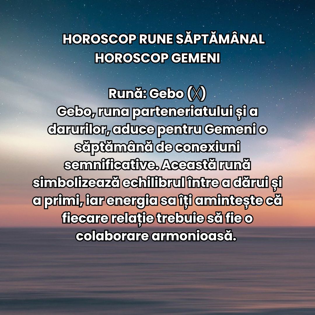 Gebo, runa parteneriatului și a darurilor, aduce pentru Gemeni o săptămână de conexiuni semnificative. Această rună simbolizează echilibrul între a dărui și a primi, iar energia sa îți amintește că fiecare relație trebuie să fie o colaborare armonioasă. În această perioadă, vei simți nevoia de a aprofunda legăturile cu cei din jur, fie că este vorba de parteneriate personale sau profesionale. Gebo îți arată că puterea adevărată vine din uniune și din împărtășirea resurselor emoționale sau spirituale. Fii deschisă să primești darurile pe care Universul le are pregătite pentru tine, fie ele vizibile sau subtile.