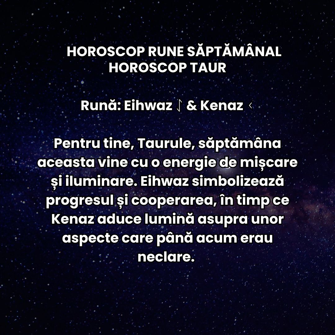 Pentru tine, Taurule, săptămâna aceasta vine cu o energie de mișcare și iluminare. Eihwaz simbolizează progresul și cooperarea, în timp ce Kenaz aduce lumină asupra unor aspecte care până acum erau neclare. Este o perioadă ideală pentru a clarifica neînțelegerile din relațiile personale sau pentru a rezolva o problemă care te-a împiedicat să avansezi.