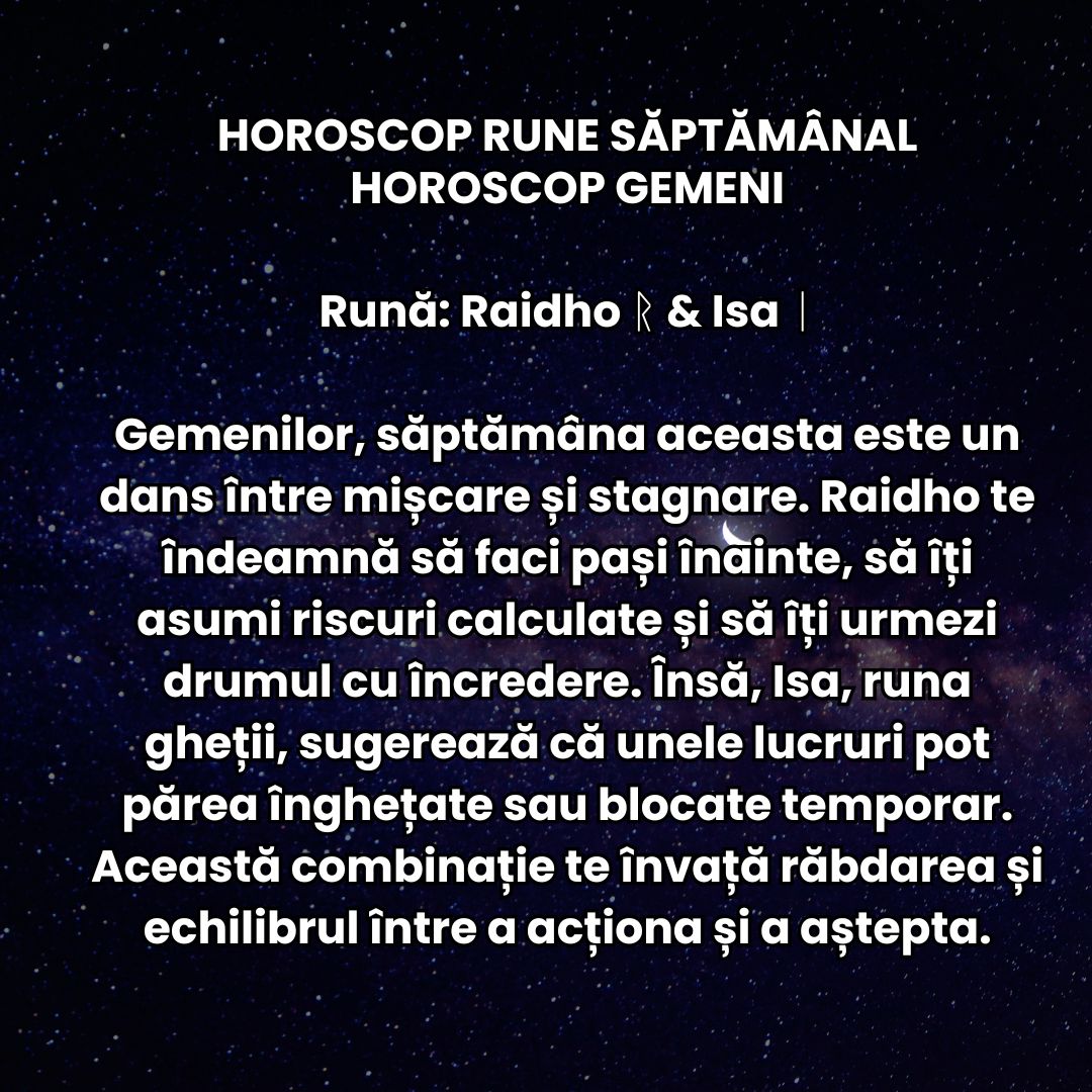 Gemenilor, săptămâna aceasta este un dans între mișcare și stagnare. Raidho te îndeamnă să faci pași înainte, să îți asumi riscuri calculate și să îți urmezi drumul cu încredere. Însă, Isa, runa gheții, sugerează că unele lucruri pot părea înghețate sau blocate temporar. Această combinație te învață răbdarea și echilibrul între a acționa și a aștepta.