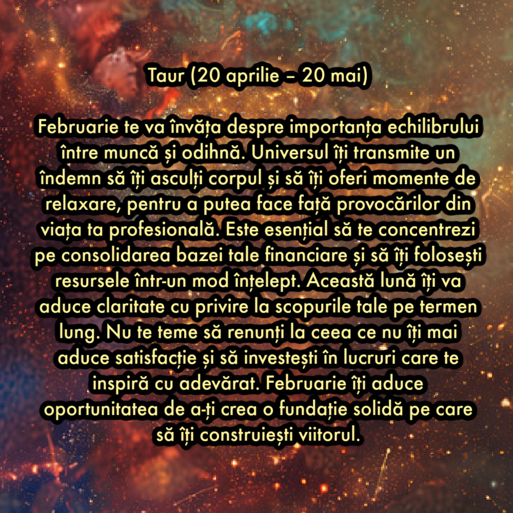 Februarie te va învăța despre importanța echilibrului între muncă și odihnă. Universul îți transmite un îndemn să îți asculți corpul și să îți oferi momente de relaxare, pentru a putea face față provocărilor din viața ta profesională. Este esențial să te concentrezi pe consolidarea bazei tale financiare și să îți folosești resursele într-un mod înțelept. Această lună îți va aduce claritate cu privire la scopurile tale pe termen lung. Nu te teme să renunți la ceea ce nu îți mai aduce satisfacție și să investești în lucruri care te inspiră cu adevărat. Februarie îți aduce oportunitatea de a-ți crea o fundație solidă pe care să îți construiești viitorul.